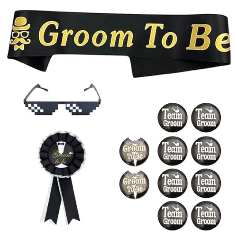 This elegant 13-piece set is designed to enhance the festive atmosphere of the stag party, providing a cohesive and celebratory identity for the groom and his party. It includes durable metal badges for groomsmen, an oversized sash bearing the 'Groom' title in glittering lettering, and a pair of novelty mosaic vision goggles with shatterproof lenses. Each item is thoughtfully crafted to hold their form and appearance through lively events, while the sash's soft polyester ensures comfortable wear during extended festivities.