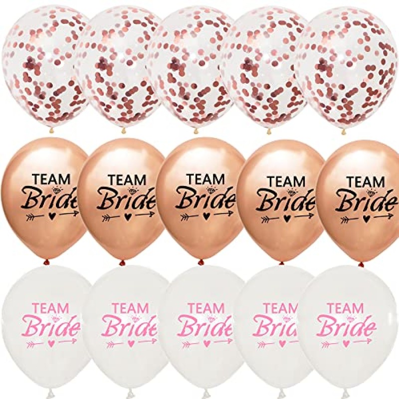 - Includes 15 latex balloons: 5 rose gold "TEAM Bride", 5 white "TEAM Bride", 5 clear with rose gold confetti