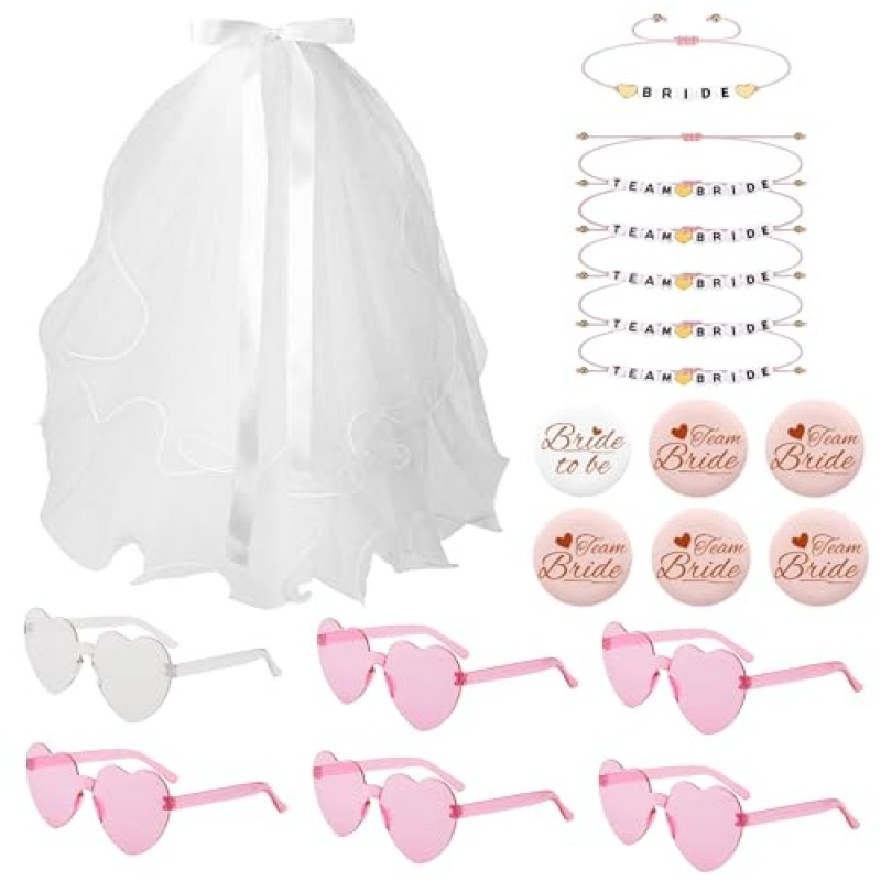 - Includes 19 pieces: hairclip bow veil (55cm), 6 braided letter heart bracelets (adjustable 8-31cm), 6 pairs of transparent heart-shaped glasses, 1 bridal badge, and 5 bridal party badges.