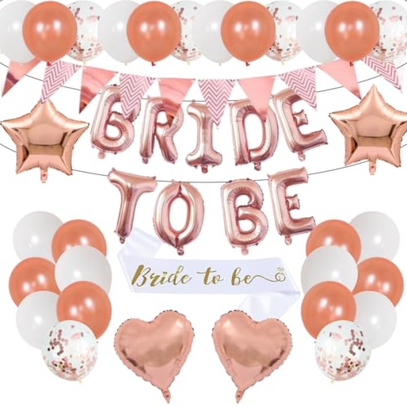 This elegant balloon set is designed to enhance the celebratory atmosphere of bridal showers and hen parties with a refined rose gold palette. Including letter balloons spelling 'BRIDE TO BE,' along with complementary foil and confetti-filled balloons, it offers a cohesive decoration scheme that effortlessly elevates the setting.