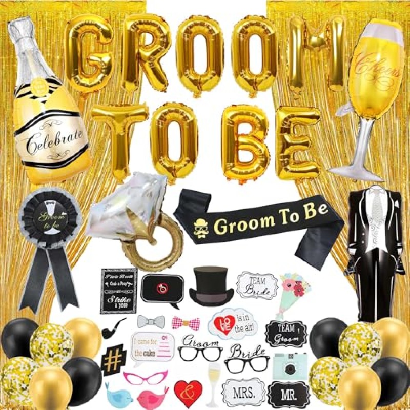 - Includes 1 gold tassel curtain, 1 'Groom-To-Be' sash, 1 foil balloon banner, 22 photo props, 4 foil balloons, and 12 latex balloons with gold, black, and confetti designs
