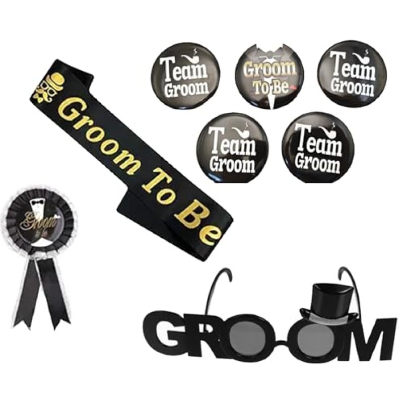 This 8-piece set is thoughtfully curated to support pre-wedding gatherings, particularly stag dos and bachelor parties. It includes a sleek black satin sash embossed in gold, declaring the wearer as the groom-to-be, alongside an elegant boutonniere, a pair of stylish sunglasses, and five team badges. Each piece is designed to complement the celebratory atmosphere while providing practical ease of wear with secure fastenings and an adjustable sash to suit all sizes.