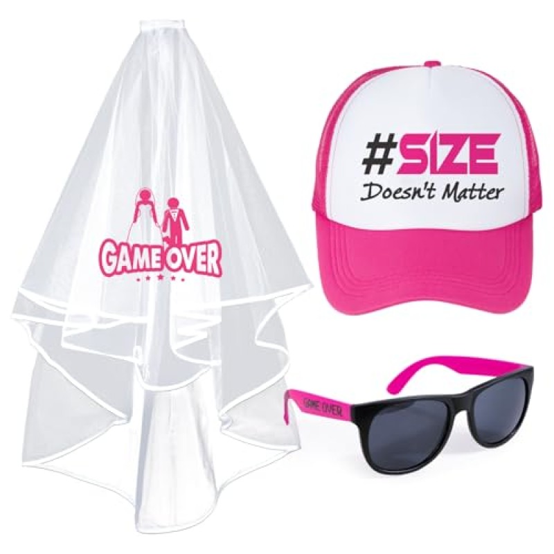 - Includes: 1 adjustable pink hat, 1 white two-layer tulle veil, 1 pair of pink and black glasses