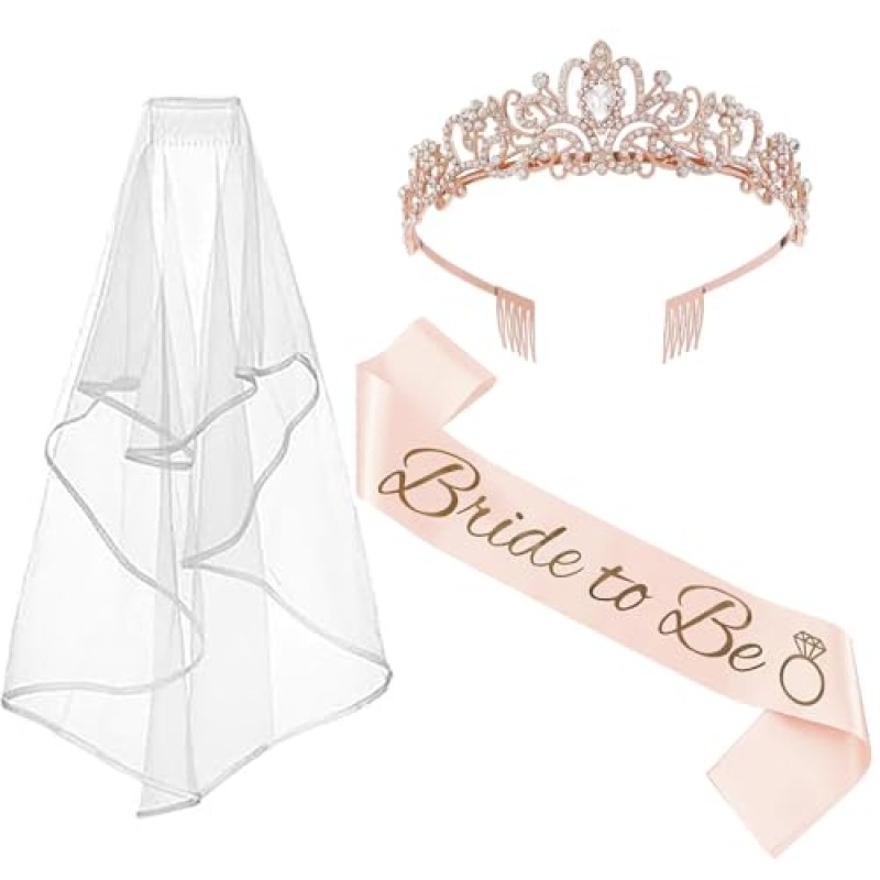 - Includes white bridal veil with comb, rose gold satin sash, and tiara headband