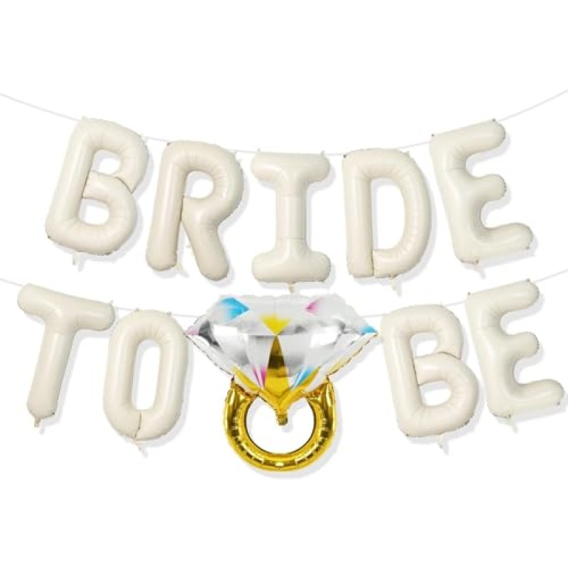 This elegant balloon banner features a collection of cream white foil letter balloons spelling out ‘BRIDE TO BE’ alongside a delicate diamond ring-shaped mylar balloon. Designed to enhance bridal celebrations, it complements various wedding-related events such as bachelorette parties, bridal showers, engagement gatherings, and ‘She Said Yes’ moments with a refined neutral palette.