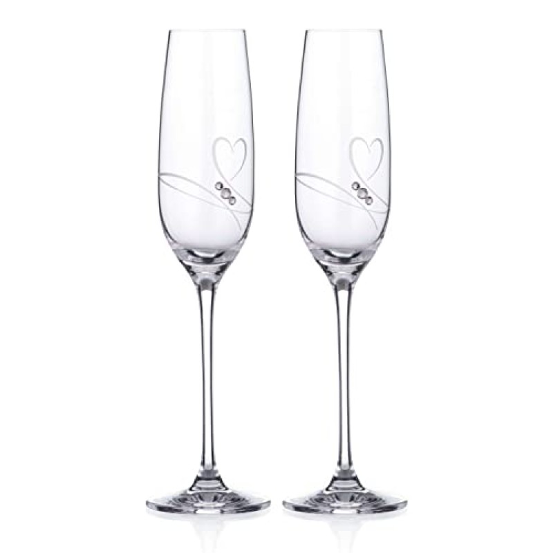 This set of two champagne flutes from DIAMANTE offers a refined choice for toasting special moments during your wedding reception or anniversary celebrations. Each flute is crafted from ultra-clear, premium blown lead-free crystal, providing exceptional clarity and a delicate appearance that enhances the elegance of your tabletop. The hand-cut 'Romance' design features a subtle yet graceful motif of hearts, embellished with three genuine Swarovski crystals per glass, delivering a discreet sparkle that complements the atmosphere without overpowering it.