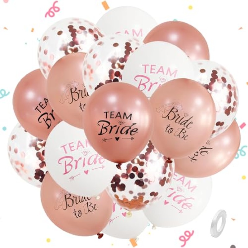- Varied styles: rose gold confetti, "TEAM Bride" in rose gold, white, pink, and clear with "Bride to Be"