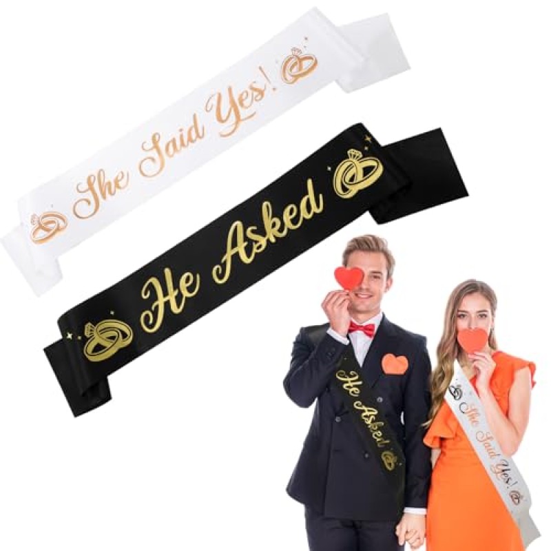 This elegant sash set includes a white 'I said yes!' sash for the bride and a black 'I asked!' sash for the groom, designed to beautifully commemorate the engagement occasion. Crafted from premium satin with glitter detailing and foil lettering, these sashes offer a refined accessory suitable for engagement parties and bridal showers. Each sash measures approximately 31.5 inches in length and 3.74 inches in width, making them comfortably wearable for most guests. Included safety pins ensure secure attachment while maintaining an impeccable appearance throughout the celebrations. These sashes serve as memorable photo props, adding a touch of personalised charm to engagement photographs and ceremony moments. Their durable construction resists tearing and wrinkling, promising a keepsake that honours this significant milestone. Beyond the party, they also make thoughtful gifts, symbolising best wishes and the joyous commitment shared between the couple.