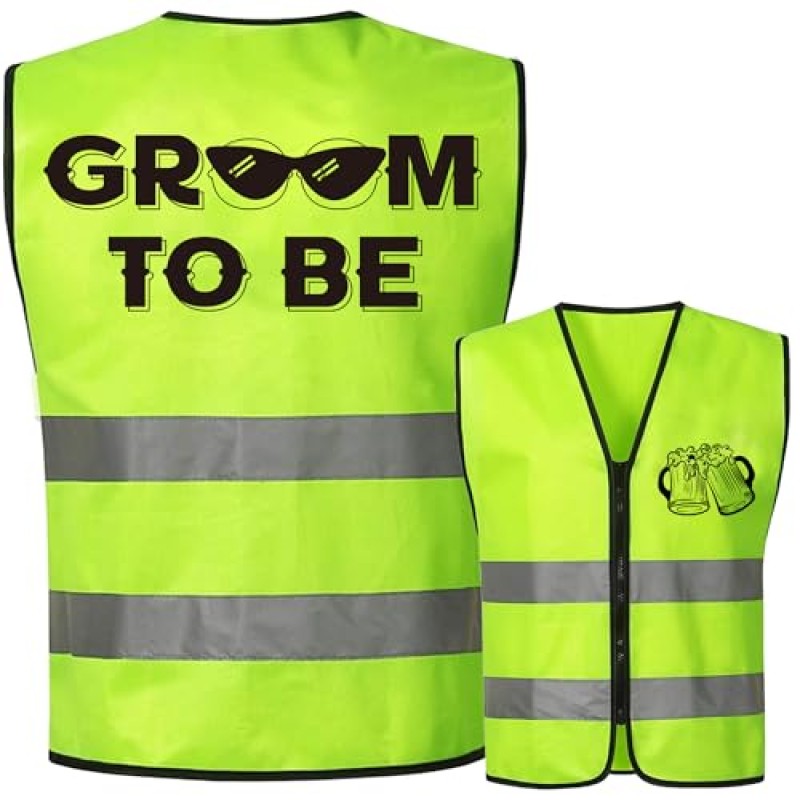 - Design: Work vest style with bold, humorous warning prints and "GROOM TO BE" slogan