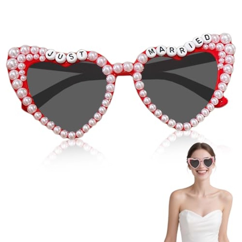These heart-shaped sunglasses are a charming accessory designed specifically with bridal celebrations in mind. Featuring a delicate frame adorned with pearl details, they bring a refined touch of sophistication to hen parties and bachelorette gatherings. The vibrant red hue complements festive attire, helping the bride-to-be and her guests make a stylish statement.
