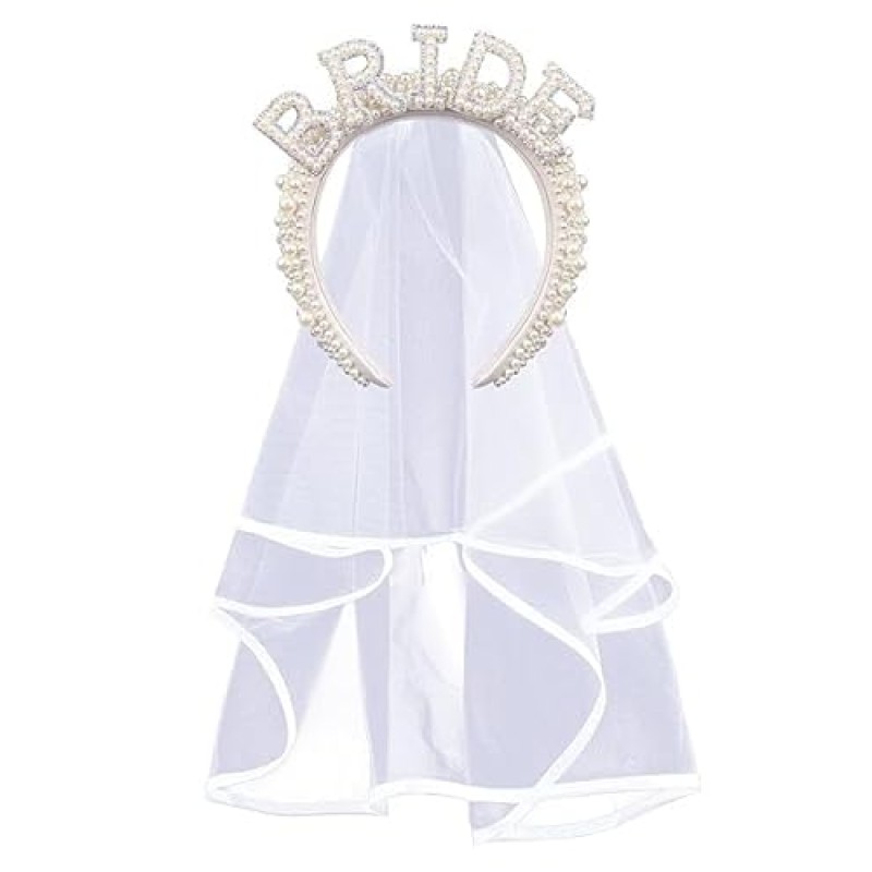 This elegant bridal headband features a natural white veil delicately attached to an elastic band, ensuring a comfortable and secure fit throughout the day. Enhanced with white pearls and rhinestone embellishments forming the word 'BRIDE', it offers a subtle shimmer that complements bridal attire without overwhelming it. The veil measures 21 inches, lending a classic yet understated style perfect for various parts of the wedding journey—from bridal prep to hen celebrations and even as a charming detail during the ceremony or reception.
