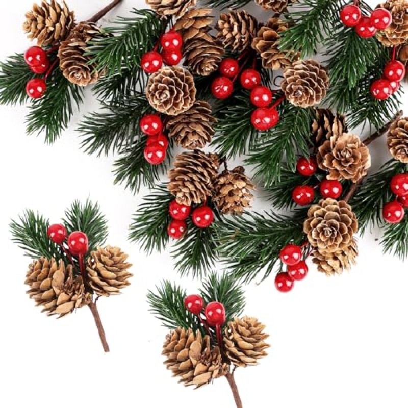 - Set includes 12 artificial pine picks with pine cones, needles, and red berries