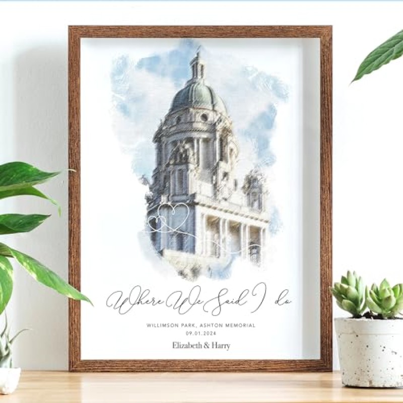 This refined watercolour print offers a personalised celebration of the couple's special day by artistically capturing the wedding venue in delicate watercolours and soft pastels. It is custom-created to include the couple’s first names, the exact venue name, and the wedding date, making it a meaningful keepsake to commemorate the ceremony. Ideal for display in the home, it lends a charming and sentimental touch to the wedding decor or can be treasured as a unique gift for anniversaries, Valentine’s Day, or seasonal occasions.