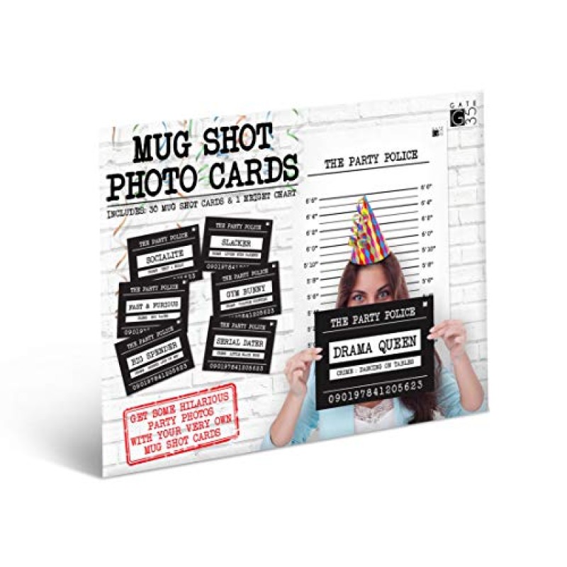 - Includes 30 unique mug shot photo signs featuring humorous messages
