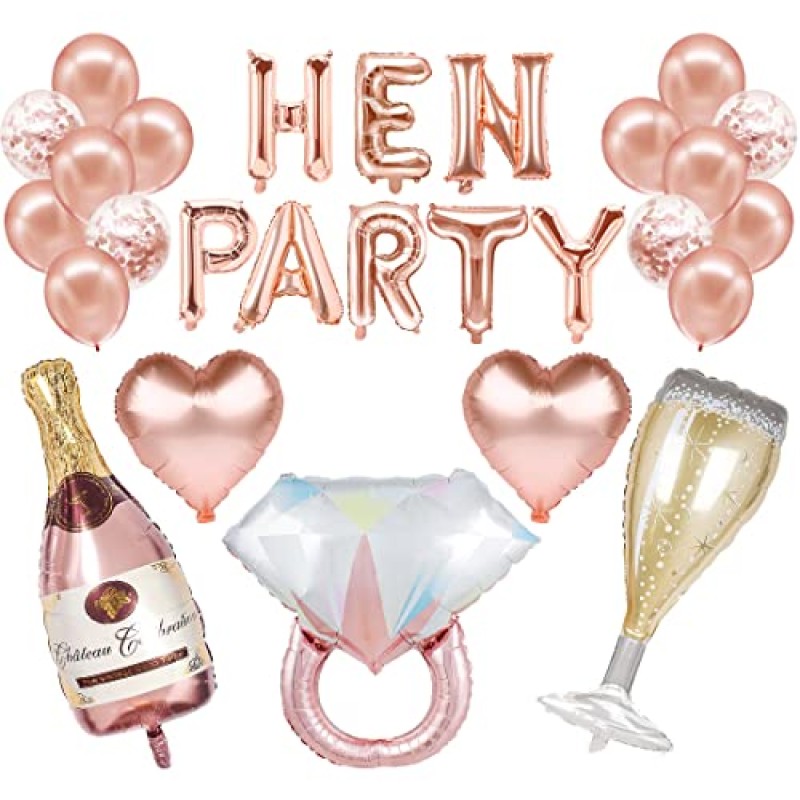 - Contents: 1 x 16" 'HEN PARTY' foil balloon; 1 x 30" diamond foil balloon; 2 x 18" heart-shaped foil balloons; 1 x 40" beer foil balloon; 1 x 40" glass foil balloon; 4 x 12" rose gold sequined latex balloons; 10 x 12" rose gold latex balloons; 1 x 10m rose gold ribbon