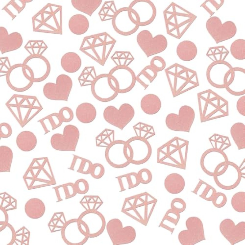 - Contains 100 pieces of rose gold confetti in shapes including hearts, diamond rings, circles, and "I DO" letters