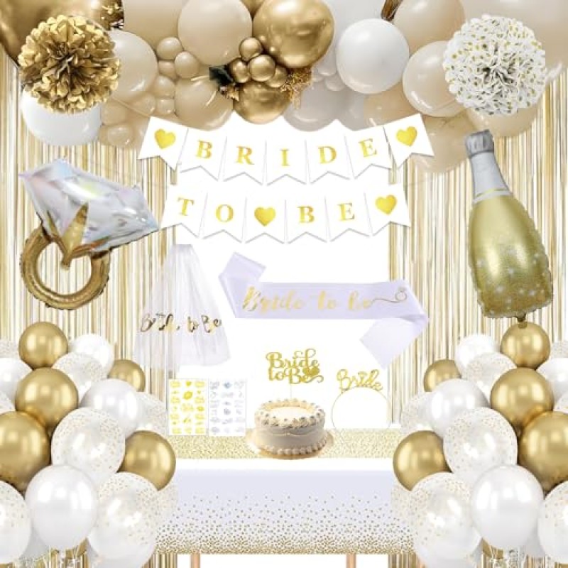 - Contains: 1 'BRIDE TO BE' metallic foil banner, 1 white gold satin sash (160 x 9.5 cm), 1 gold tiara (5.9 x 6.5 in), 1 white veil, 1 white gold tablecloth (54 x 108 in), 1 gold rain curtain (39 x 79 in), 2 tattoo stickers, 10 gold metallic balloons, 10 white balloons, 10 sand white balloons, 5 gold dot balloons (12 in), 2 foil balloons, 2 pompoms, 1 cake topper, 1 10 m ribbon, 4 glue pieces, 1 16 ft balloon chain.