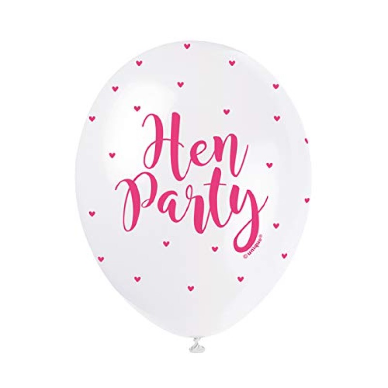 - Design features "Hen Party" text and hearts in a stylish white and pink colour scheme.