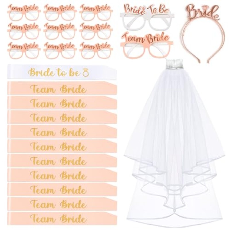 This accessories set is designed to enhance the bride's celebration and support the bridal party during pre-wedding festivities. It features elegant sashes for the bride and her team, crafted with a smooth, silky feel that adds a touch of sophistication whether paired with casual or dressy attire. The set includes a delicate white veil with an iron comb to ensure secure and comfortable wear, maintaining its shape through lively moments. Alongside these, rose gold glasses with bright lettering help the bridal party stand out in photos and gatherings, lending a glamorous flair to hen do nights and team photos.